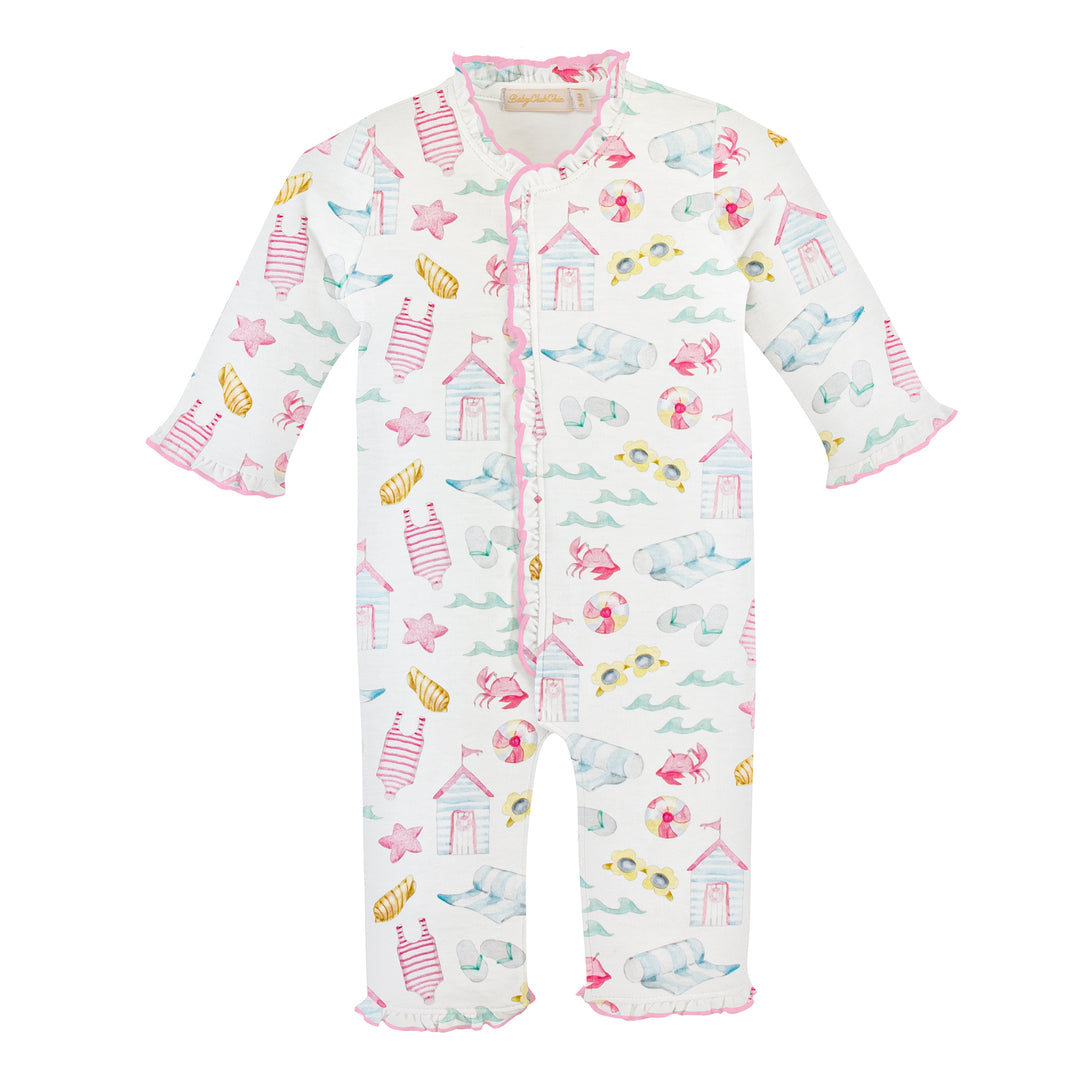 "Get ready to have some fun in the sun with our Summer Fun Printed Coverall w/Ruffles! Made of soft Pima cotton, this coverall not only keeps your baby comfortable, but also adds a stylish touch with its cute ruffled design. Perfect for all your summer adventures!"