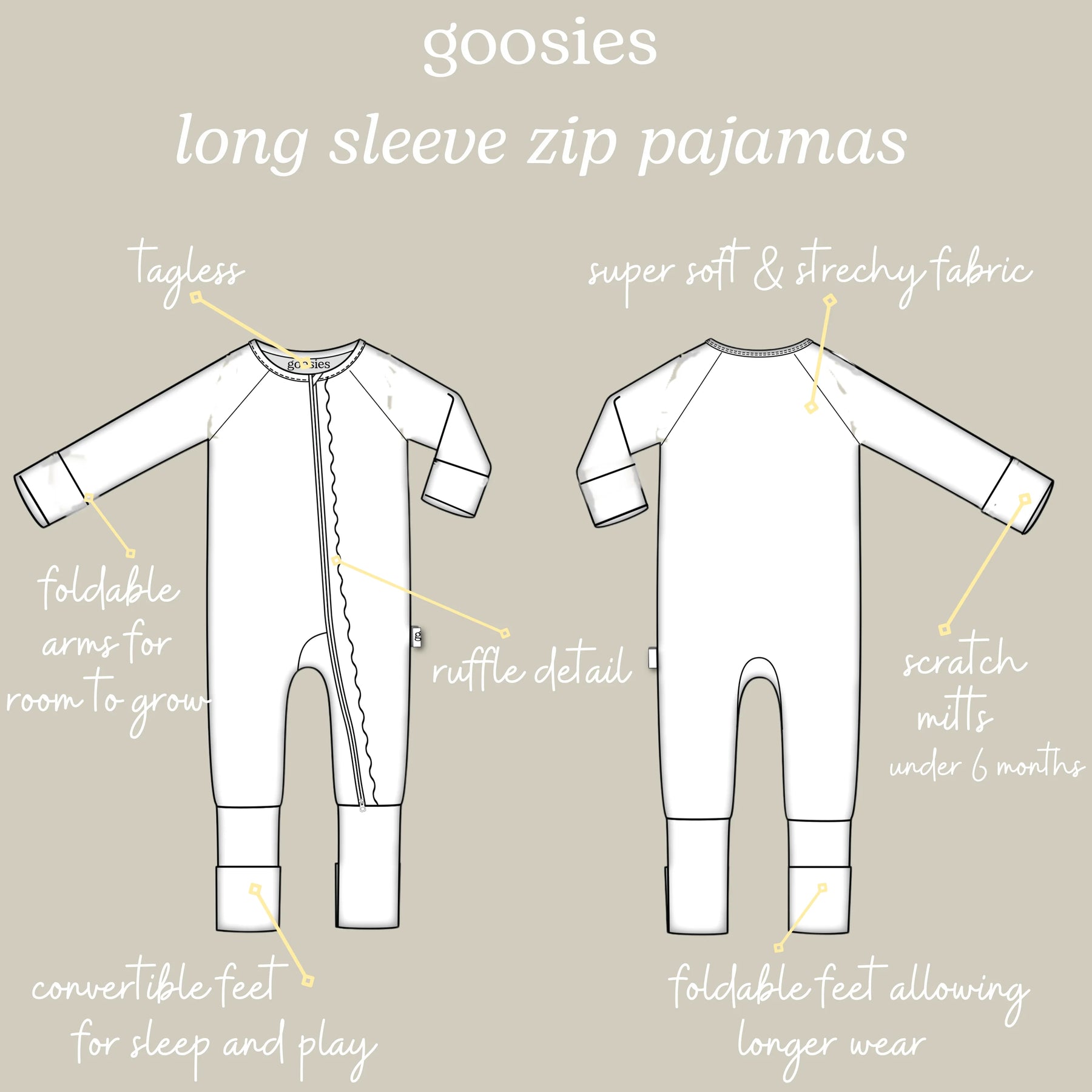Our Zip Pajamas feature a two way zipper for easy diaper changes, convertible feet and scratch mitts for sizes 0-3 months and 3-6 months.