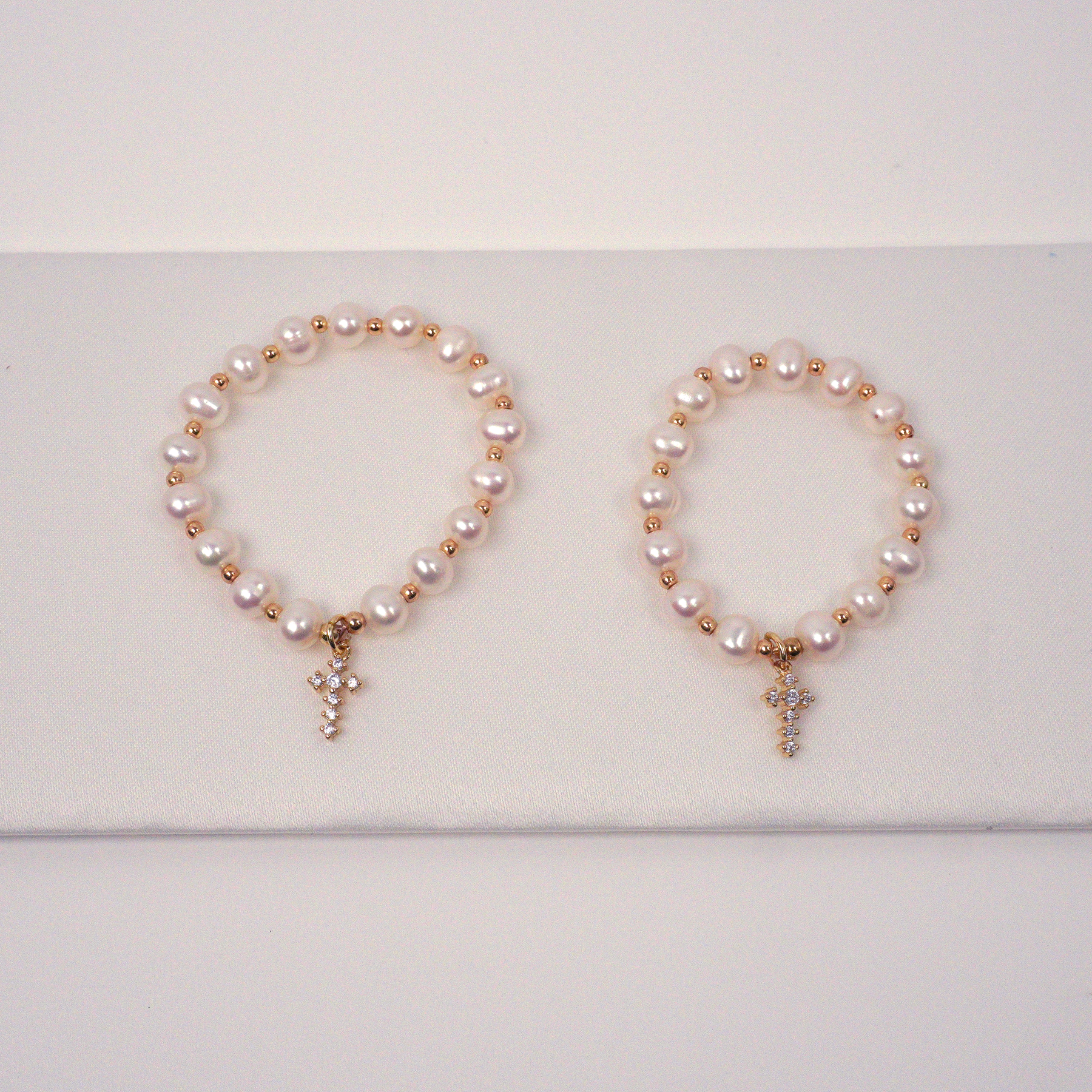 The Marcela Fancy Jeweled Cross Water Pearl Bracelet is a perfect way to mark your baby's special christening day. This bracelet features a delicate cross charm adorned with sparkling jewels and strung on a strand of luminous freshwater pearls.