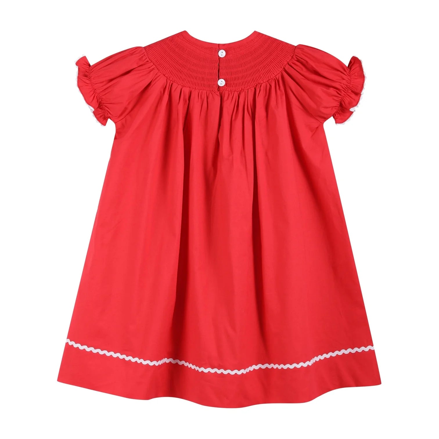 Spread holiday cheer with our Red Santa Sleigh Bishop Dress! Adorned with delightful smocking along the neckline featuring embroidered Santa and sleigh making it the perfect blend of winter charm and Christmas cuteness. Made in a pretty red cotton, it's an adorable choice for festive occasions and this dress is sure to make spirits bright!