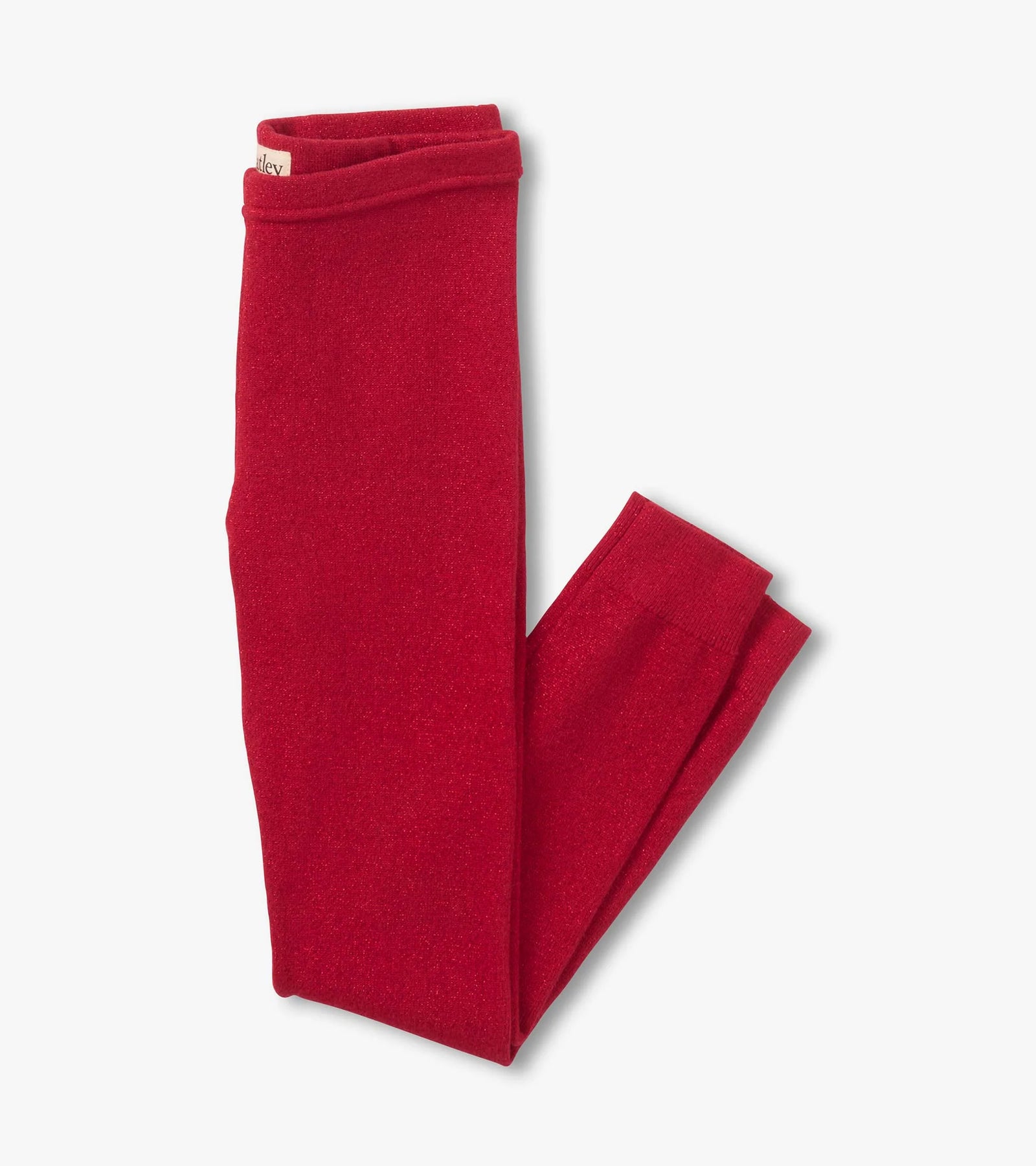 Essential to every wardrobe, these stretchy red shimmer knit leggings will make exploring easy, comfortable, and stylish! Paired with a dress or just with a simple tee, they'll want to wear these all day, every day.