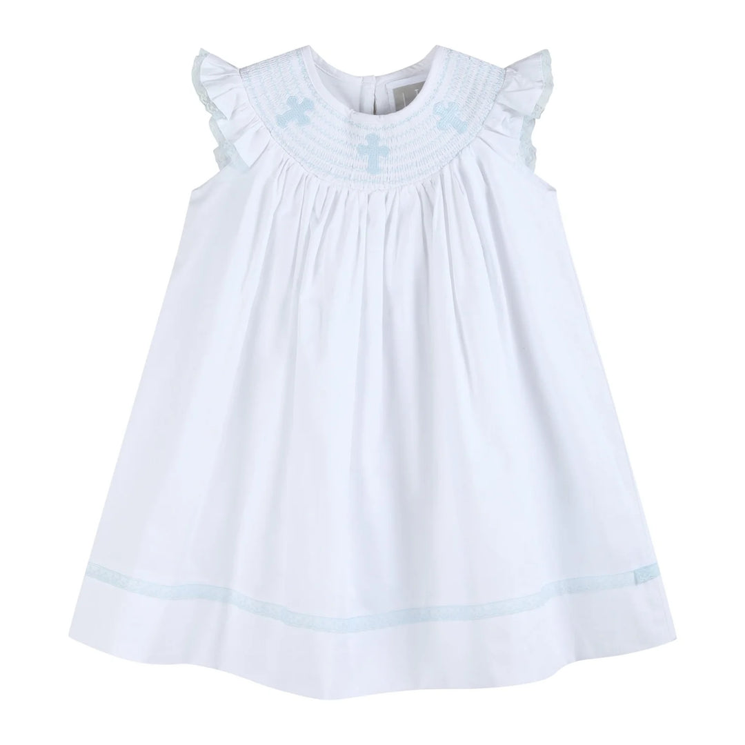 White and Blue Crosses Smocked Bishop Dress