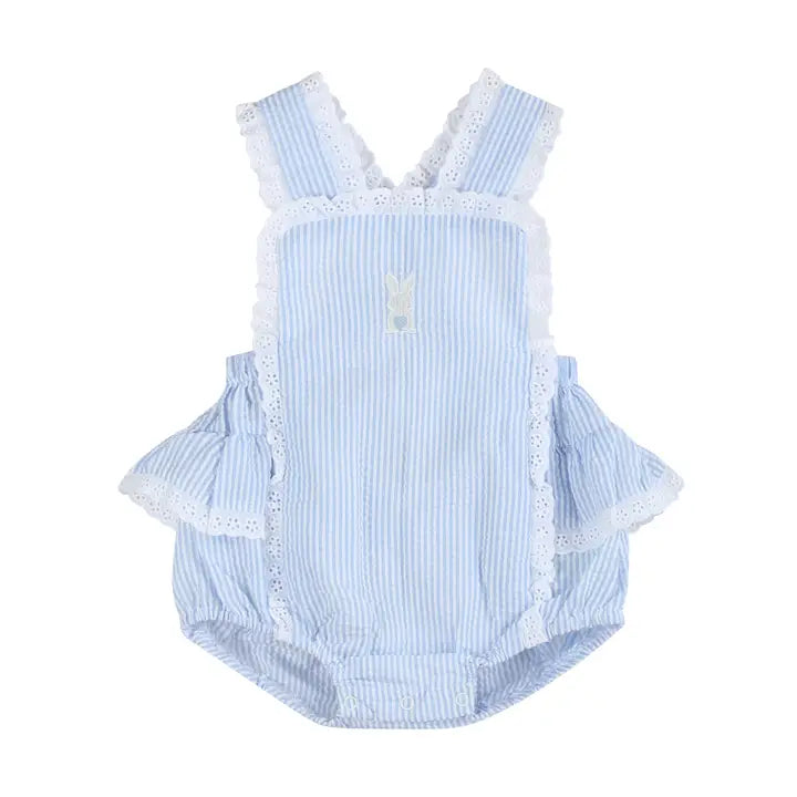 Light Blue Seersucker Easter Bunny Ruffle Romper | Girls