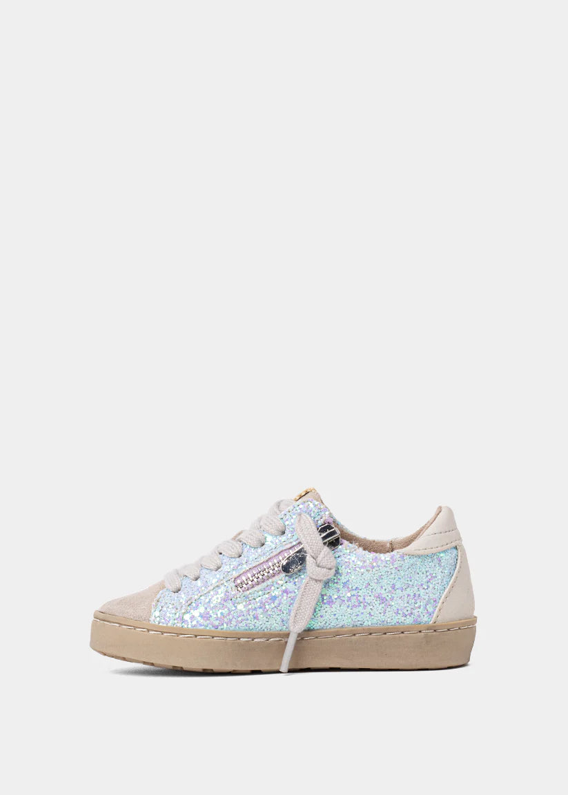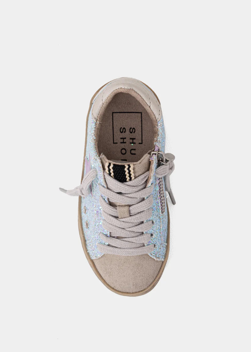 For the little star who loves a little extra. PAULA MINI in Ice Glitter is a dreamy blend of shimmer and sweet pastels. Its iridescent glitter upper catches every light, while the soft pink star adds a playful contrast. The pale faux suede toe and metallic ivory accents make this sneaker feel both magical and modern. Finished with thick silver-gray laces and our signature rubber sole, it's made for tiny steps that shine bright.