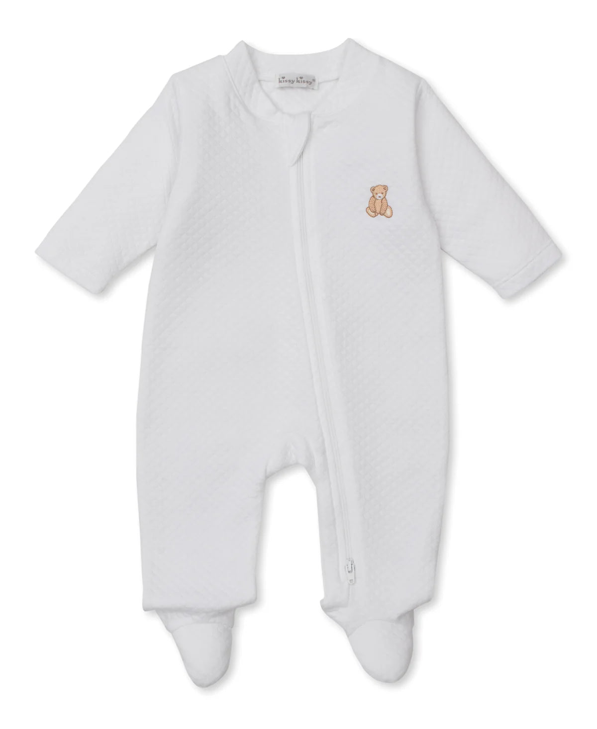 Our zippered footie features a little teddy bear embellishment and is the perfect textured footie for baby. Made from the softest Pima cotton for ultimate comfort.