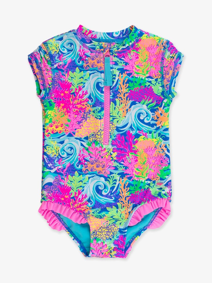 Girls Neon Ocean Coral Short Sleeve Rash Guard Swimsuit