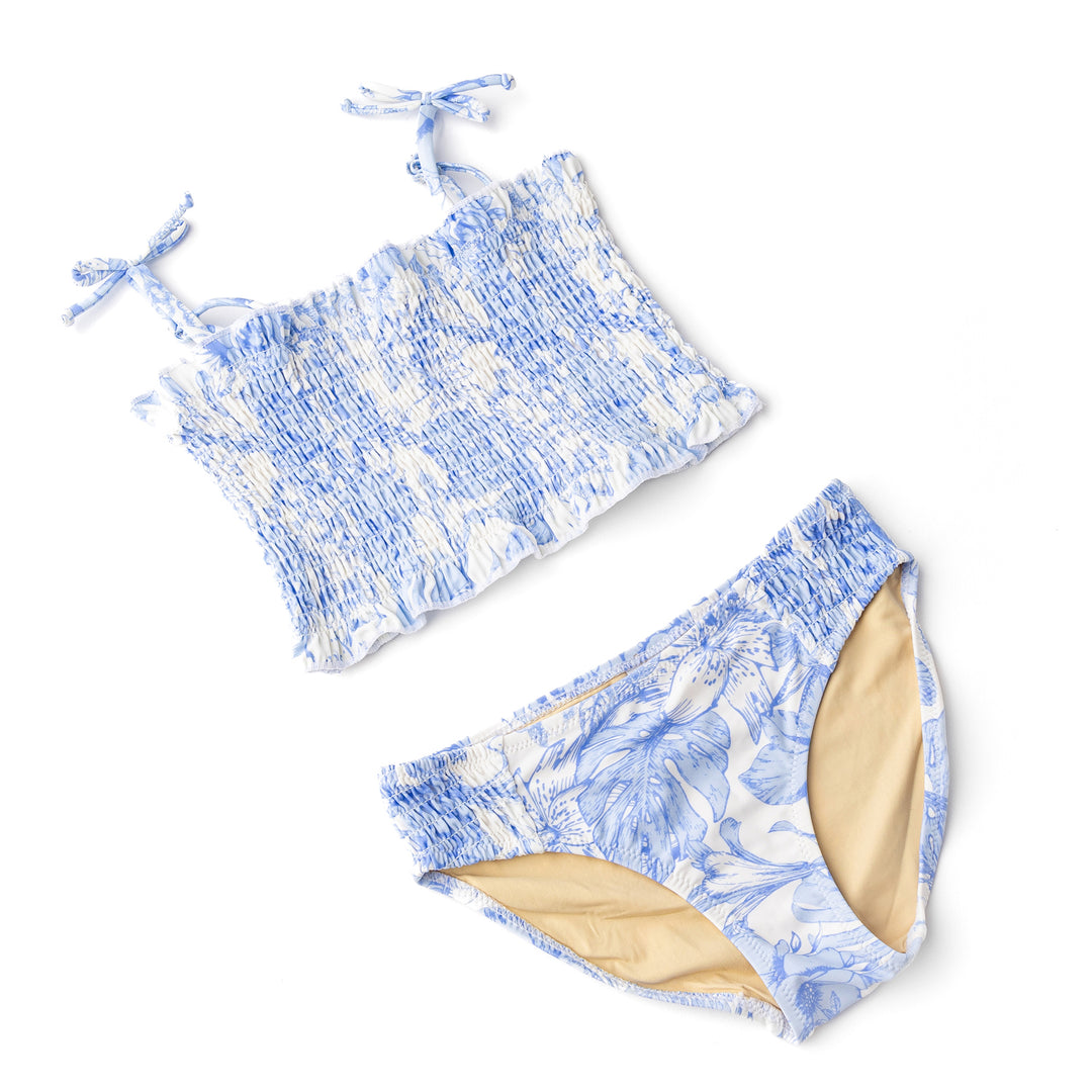 Tropical Blues Smocked Puff Sleeve Two Piece Swimsuit
