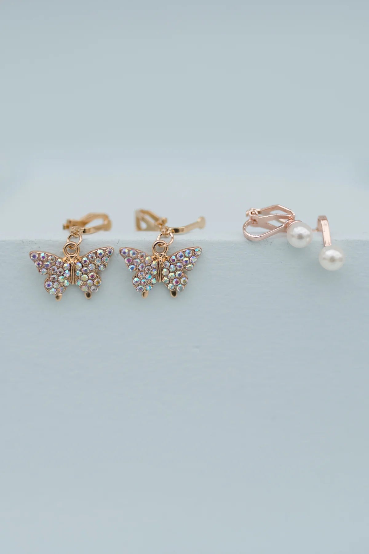 These drop-style clip-on earrings are made for children with unpierced ears. This set comes with a rhinestone-encrusted butterfly style and an elegant pearl style, made with rose gold-colored metals.