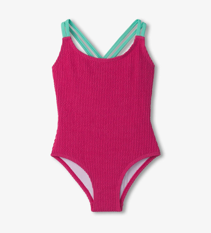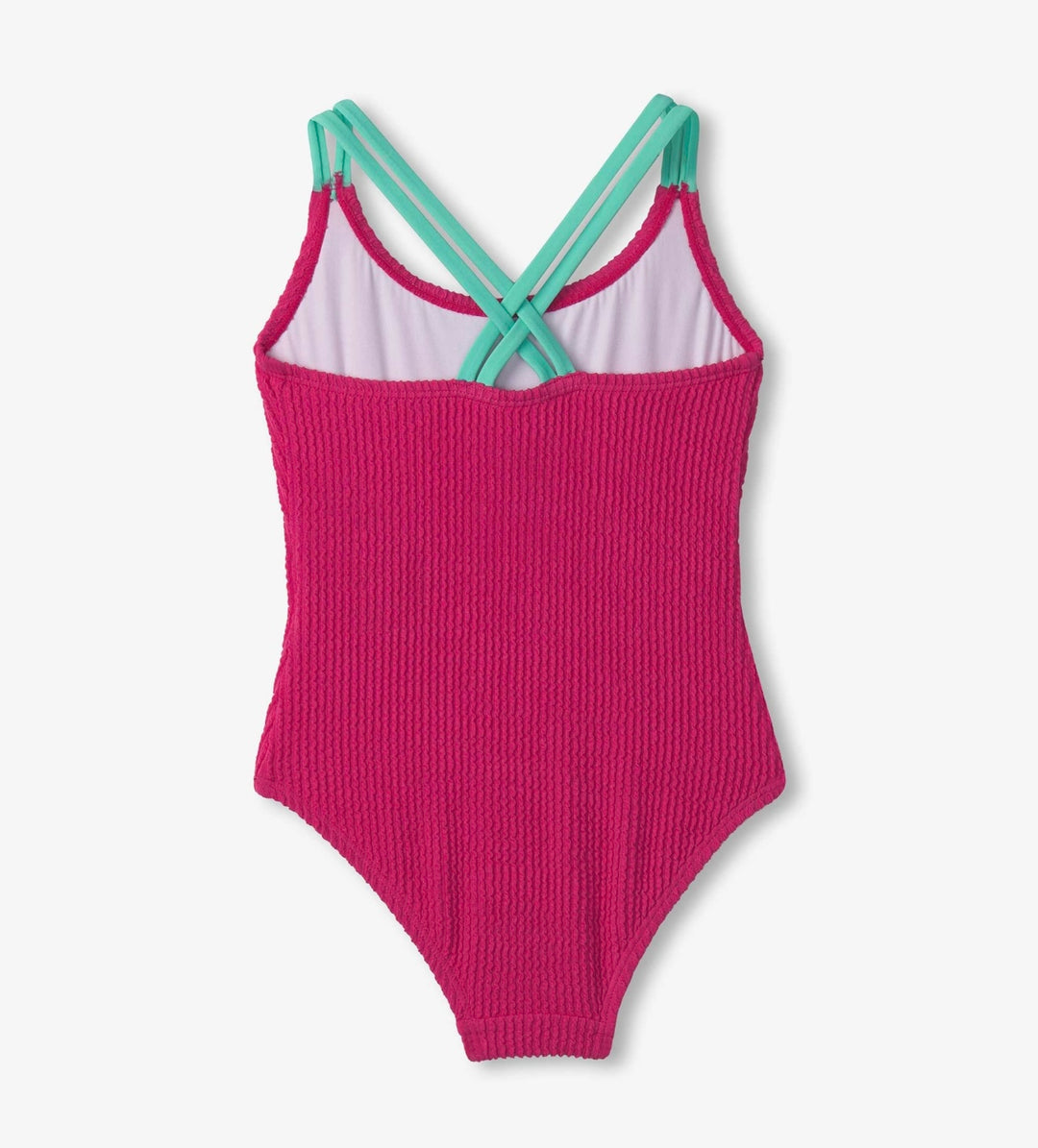 Get ready to make a splash in this vibrant Fuchsia Purple Cross Strap Crinkle Swimsuit for girls by Harley. Perfect for the beach or pool, the crinkle texture adds a playful touch while the cross strap design ensures a comfortable fit. Dive in with shade critters!