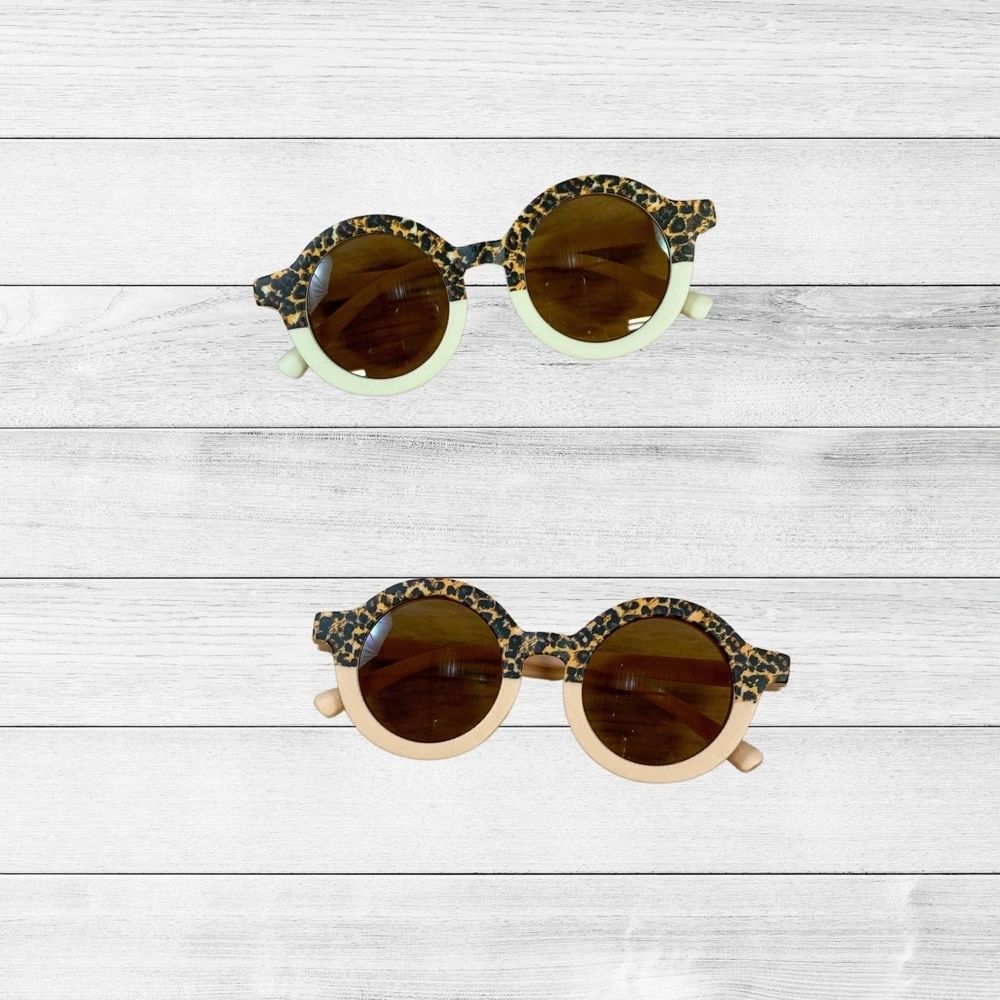 Animal print & sand or ivory matte-lined sunglasses for girls! One size, fits up to approximately 7 years.