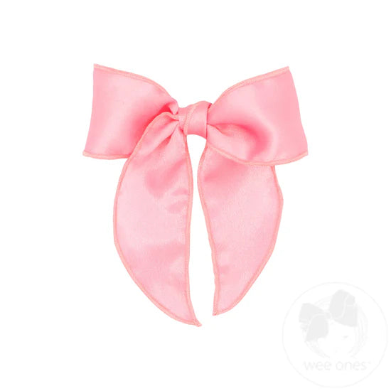 Add this perfect accessory to give your little one an extra dose of cuteness! From the eye-catching satin fabric to the whimsical bow tails, this piece is sure to make her hair day extraordinary! The whimsy tails are 4 1/2 inches in length. This bow is sure to stay in her hair all day with our patented WeeStay™ no-slip hair clip. Available in a variety of colors.