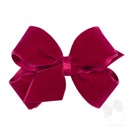 Satin and velvet together create a beautiful look for any special occasion or holiday photo. The perfect hair accessory to complement her festive fall and winter outfits. These bows are sure to stay in her hair all day with our patented WeeStay™ no-slip hair clip.