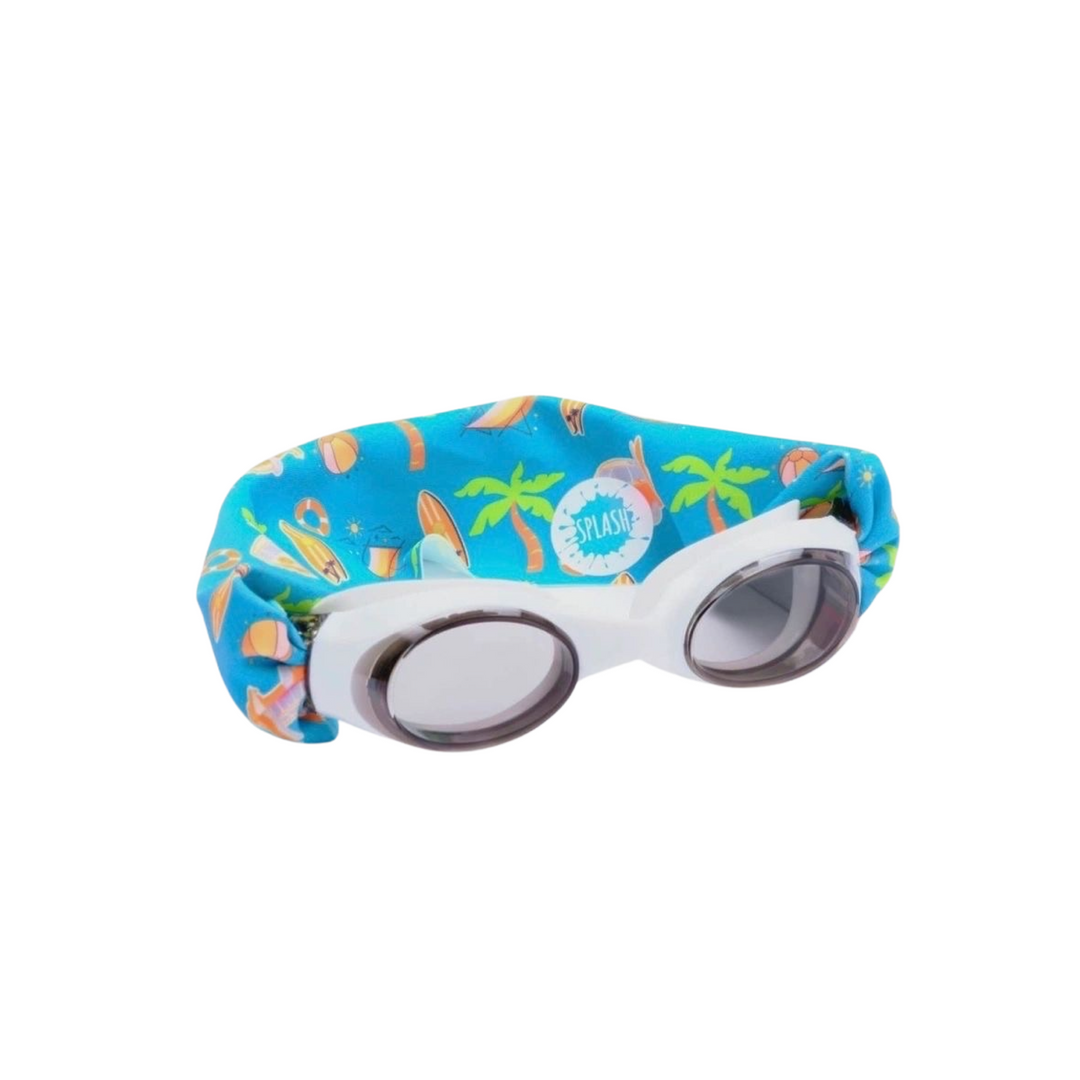 Our Surf Trip swim goggle features our tangle-free, patent-pending strap in a surf and palm print, paired with a white frame and lightly tinted grey lenses. One size fits kids to adults. Ages 3+. No more pulled or tangled hair. Fun, fashionable, comfortable. High visibility, anti-fog lenses. Shatter resistant polycarbonate lenses. Hypoallergenic-latex & pvc free. Sensory friendly.